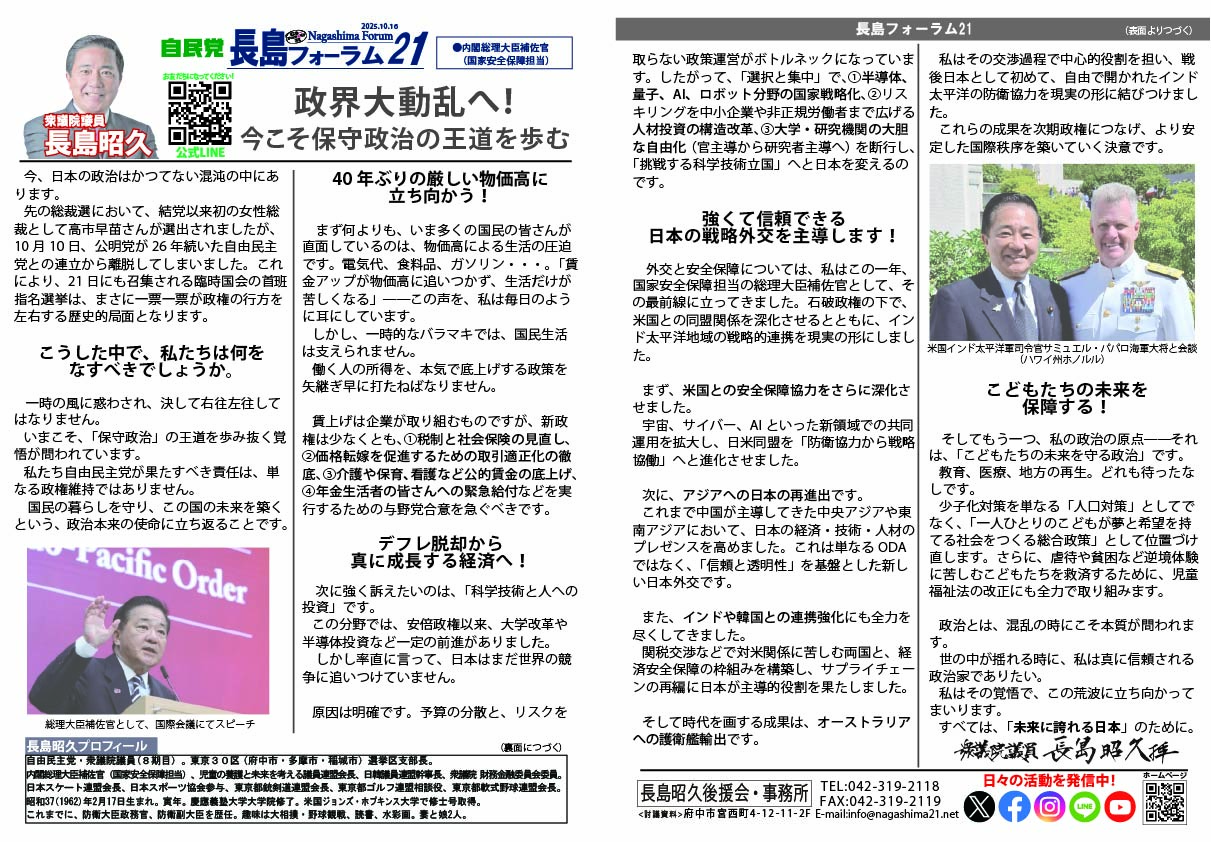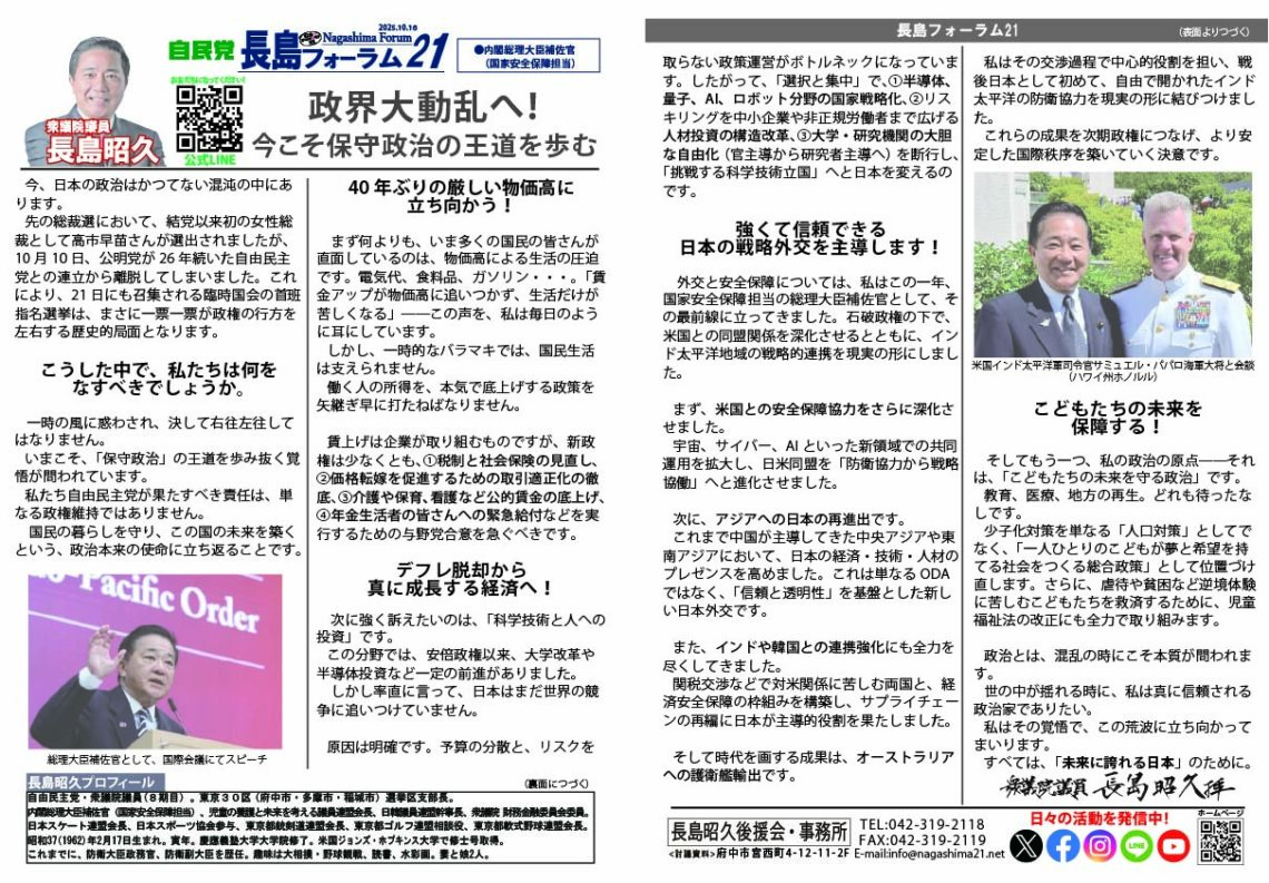 高市早苗代議士が、多くの党員の皆さまよりご支持いただき、自民党初の女性総裁となりました。 高市新総裁の下、 長島昭久は、「未来に誇れる日本」をつくるため、政府与党の一員として政策実現に邁進しております。 その長島の政治活 […]